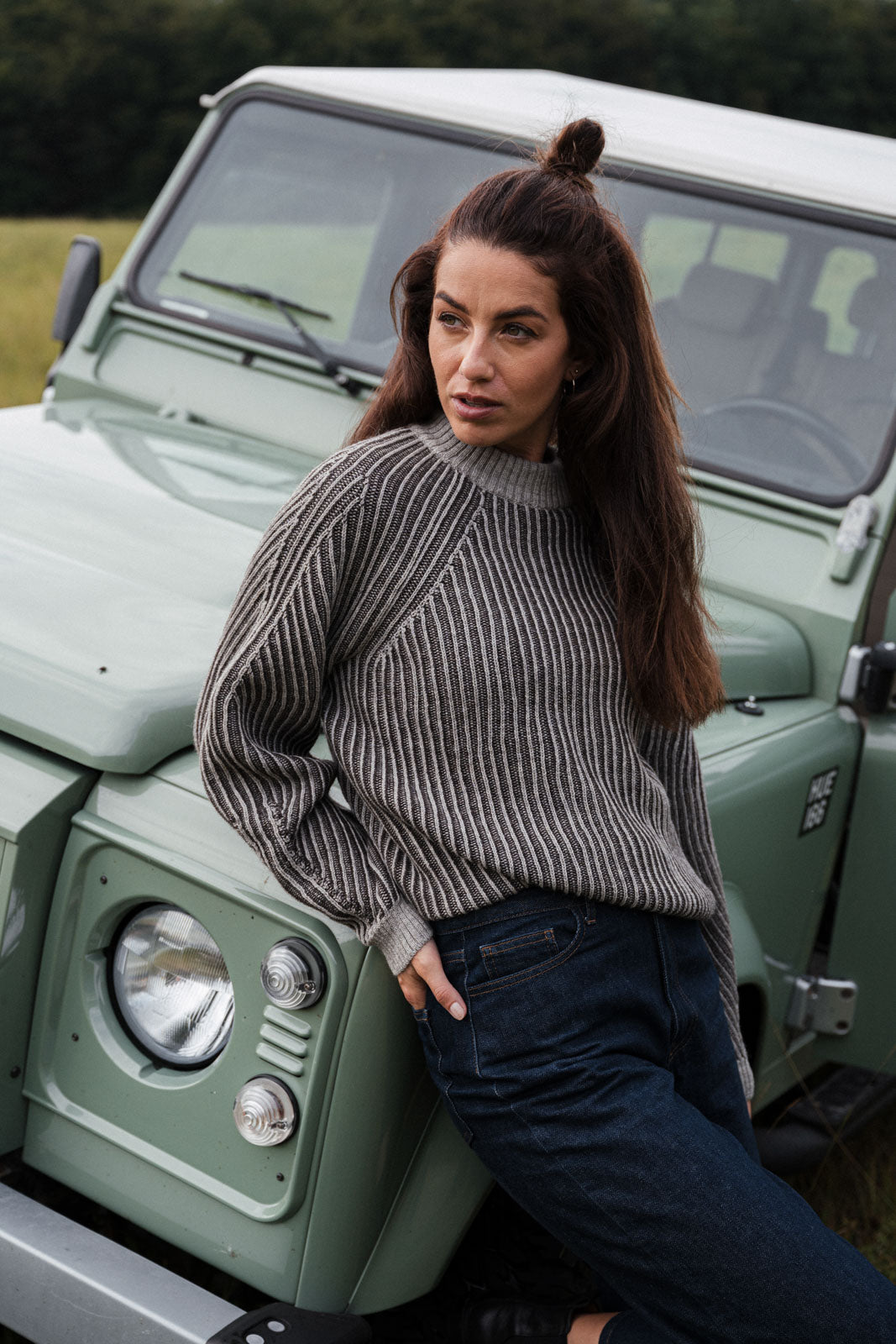 Svetr ze směsi alpakové a merino vlny s přirozenou barvou bez chemikálií. Vyznačuje se žebrováním, tvarovanými rukávy a rovně zakončeným spodním okrajem pro všestranné nošení