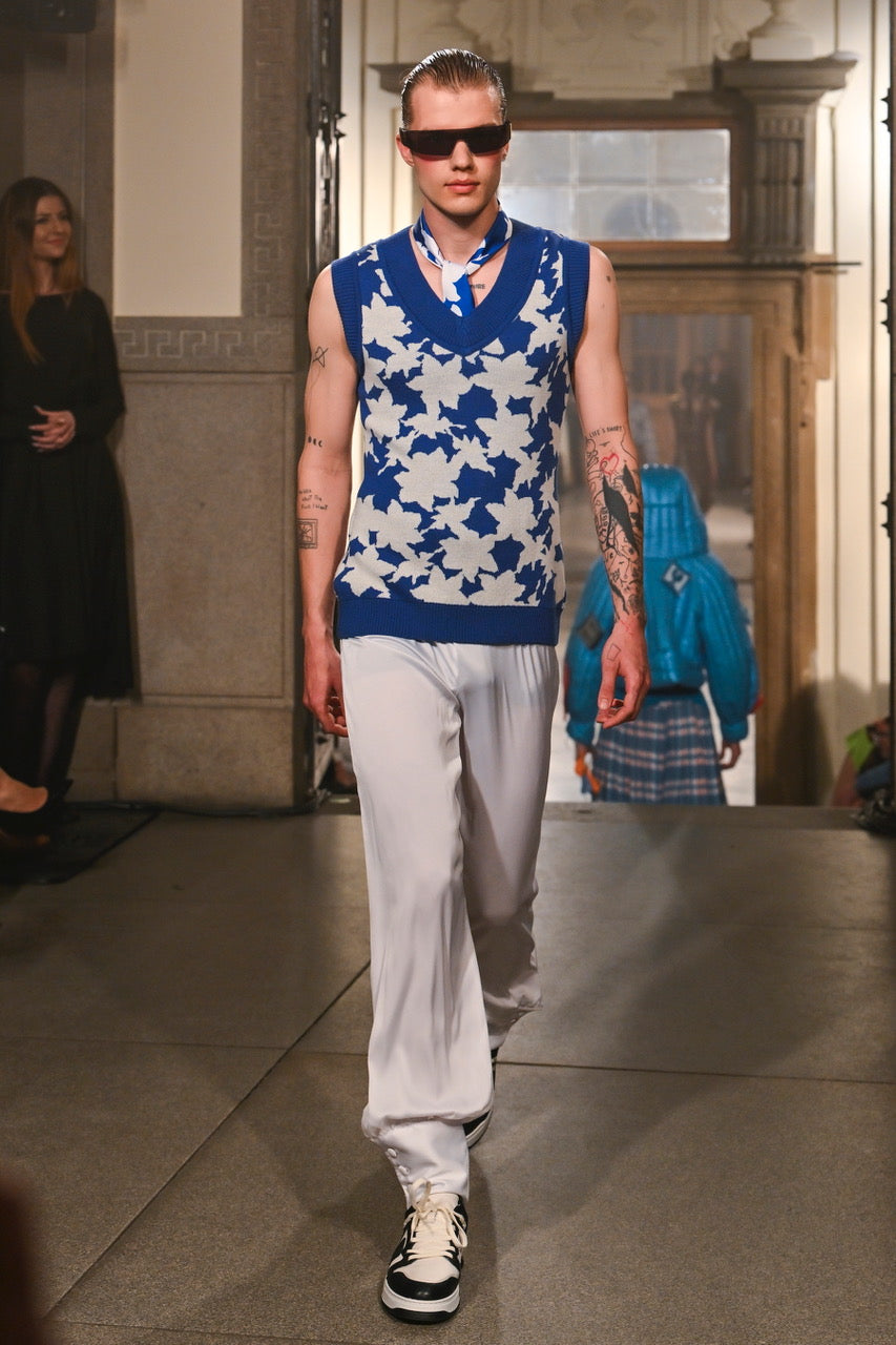 Pletená vesta z merino vlny podle střihu a designu návrháře Pavla Mikliše. Tento jedinečný kousek byl představen na Mercedes-Benz Prague Fashion Week 2024.