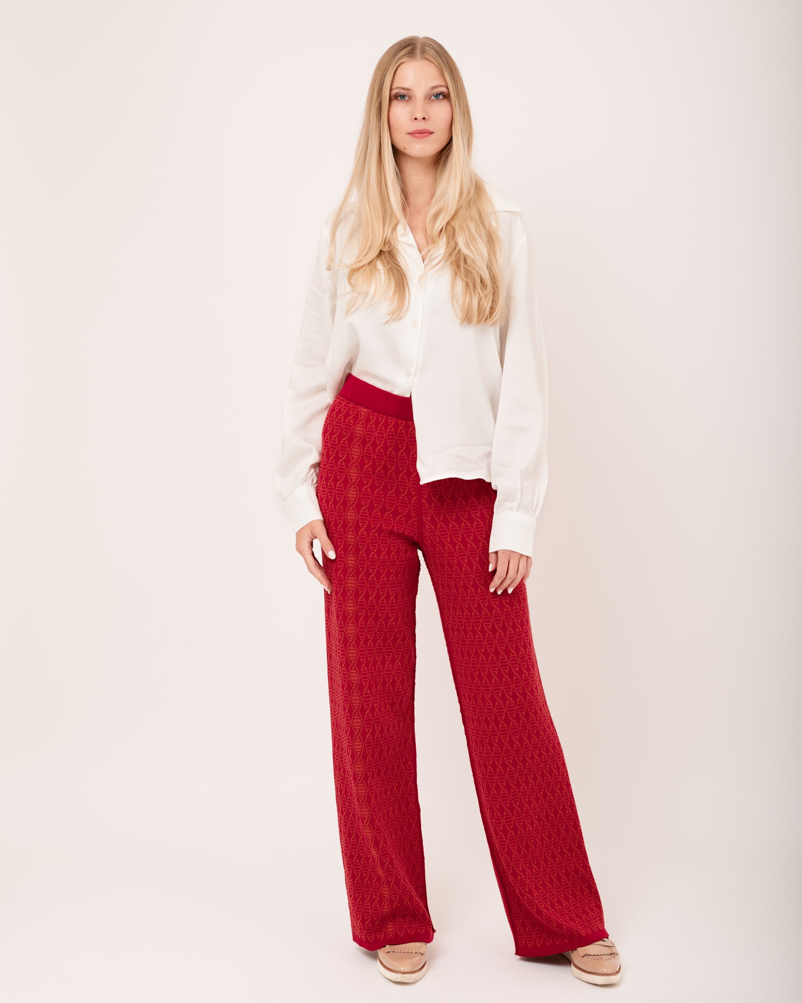 Kalhoty Flow - Dlouhé kalhoty s vysokým pasem mají elegantní rovný střih, který se vyznačuje měkkou pleteninou pro pohodlné nošení. Pas je řešen vysokou gumou v tunýlku, což zajišťuje perfektní přizpůsobení. Nohavice jsou zakončeny kontrastní dutinkou, která dodává zajímavý detail. Tyto kalhoty kombinují styl a funkčnost, ideální pro různé příležitosti.